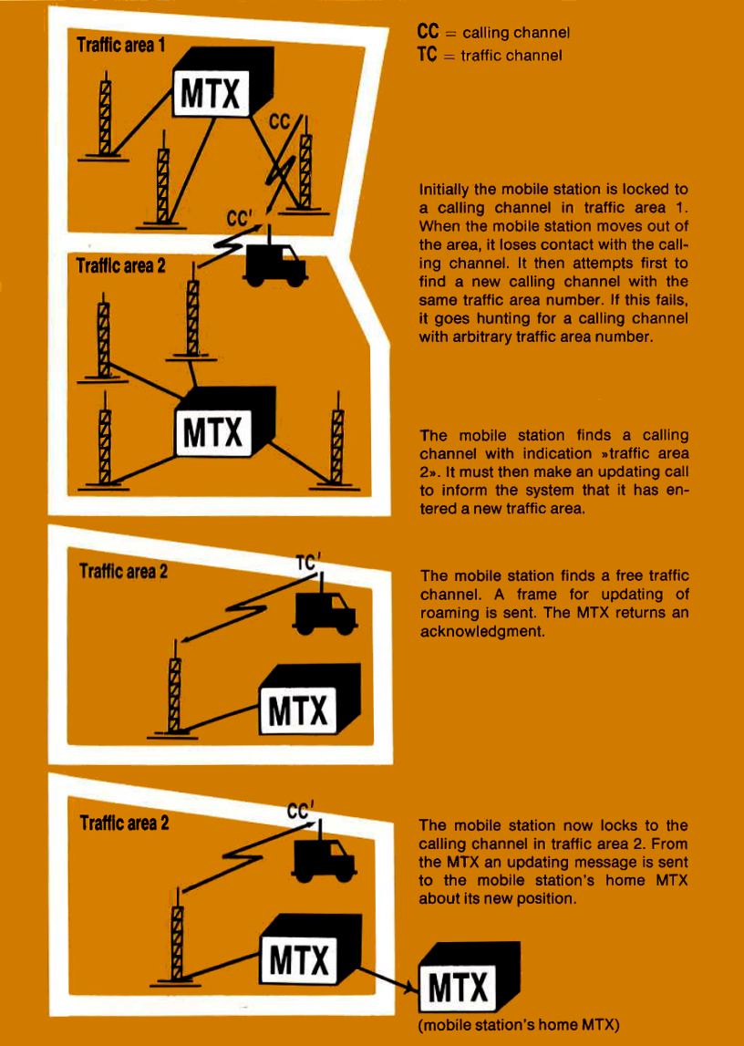 The special function which enables a person to call a mobile subscriber without knowing where he or she is, is called roaming. One need not even know whether the mobile subscriber has gone to another country. Roaming is made possible by the fact that a mobile station which leaves a traffic areas and enters a new one automatically notifies the MTX that it has entered the new areas. (location update) The location of the mobile station is stored in the mobile station's home MTX and used for routing calls to the correct area.