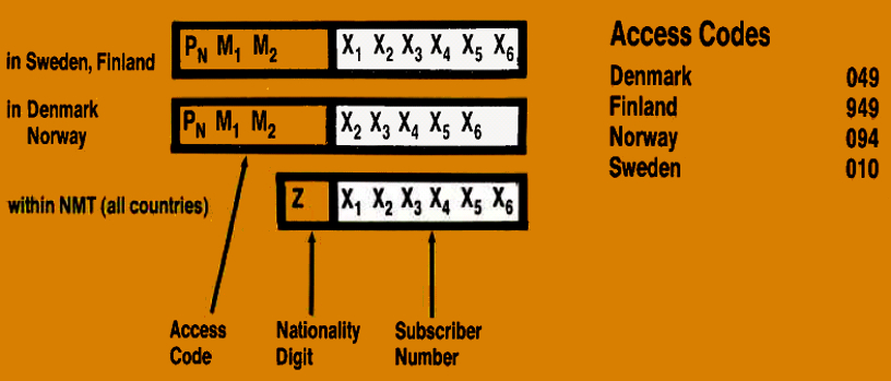 The Danish and Norwegian telephone networks permit a maximum of 7 digits after the trunk prefix PN. With an access code of type PN M1 M2 there remain 5 digits for the subscriber number. It was anticipated, however, that the system would be constructed for 6-digit subscriber number. The problem was solved by adding a sixth digit (X1) to the dialed number (X2 X3 X4 X5 X6) in all signaling in the NMT system and between MTXs. The sixth digit will be added automatically by the mobile subscriber's home MTX. The system thus provides for 6-digit subscriber number in the countries which cannot introduce this length of number when their systems first come into operation.
