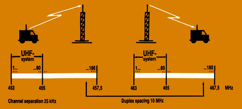 • Frequency range: 462.500 - 467.500 MHz (down-link); 452.500 - 467.500 MHz (up-link)