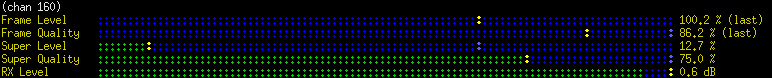 To check measurements like input level and quality, press the 'm' key. You will get an ASCII art plot of different bar graphs. They show tone / frame level and quality. The green bar shows the current level. The yellow marker shows the last/peak/average level. The light blue marker shows the target level. Some measurement like RF level, frequency offset and peak deviation are only available with SDR. Press 'm' again to turn off this view.