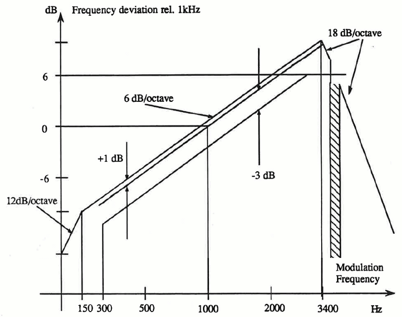 As depicted, a frequency of 1000 Hz passes the pre-emphasis without any change. The double frequency (2000 Hz) is amplified to double amplitude (+6 dB). The result is that higher frequencies are transmitted with more deviation (louder) than lower frequencies. On the receiver, the process is reversed. A frequency of 2000 Hz is lowered down to half of it's amplitude (-6 db), so it becomes the original amplitude again.