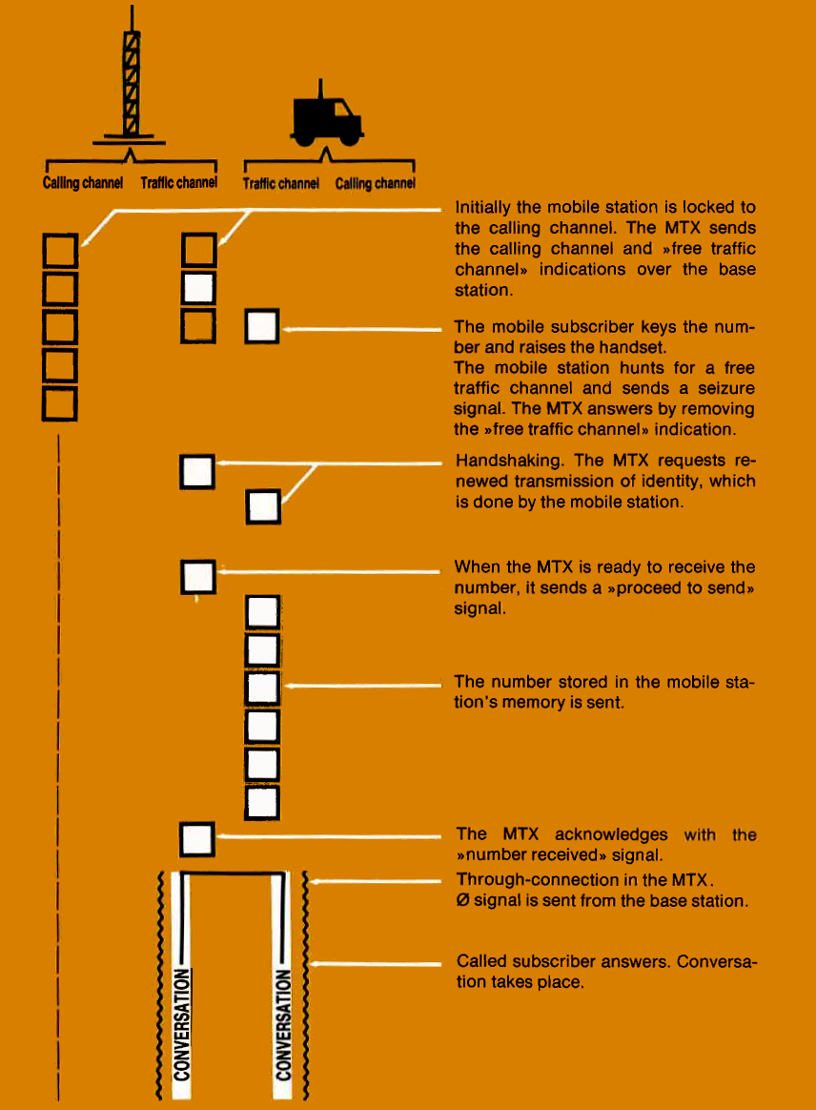 The base station transmit a paging message on the control channel. If the station ID matches, the phone will send an acknowledgment. After requesting identity, the base station orders the phone to ring. After answering the call, the compander is switched in and the audio is through-connected.