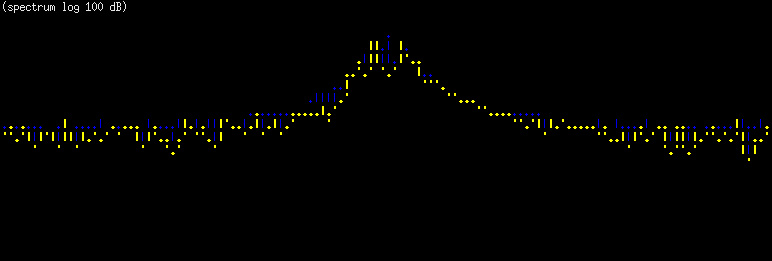 Press 's' to get an ASCII art graph of received frequency spectrum. The spectrum's bandwidth is defined by the sample rate (-s) and not by the SDR sample rate! If you don't get this nice peak, but maybe several peaks, you might have the input over-driven. Note that the peak will spread by the frequency deviation, so the peak might look noisy on the top. If the peak is quite low, check the input gain.